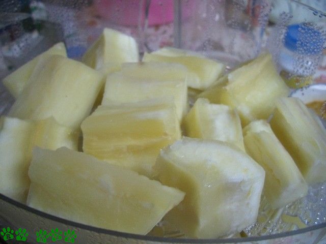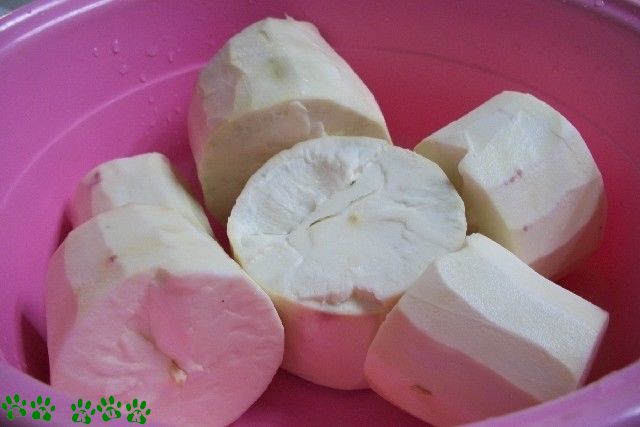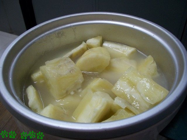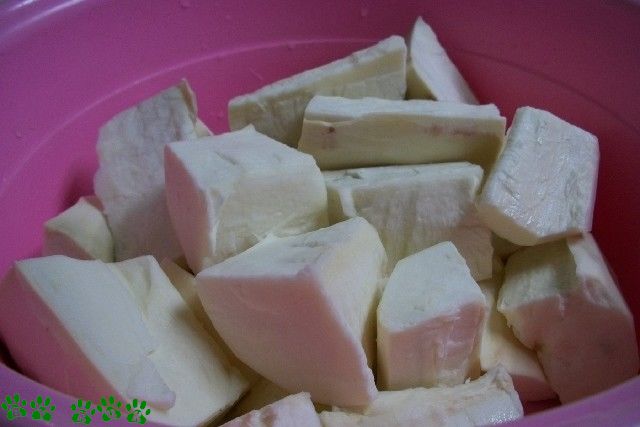 1. ปอกเปลือก ทำความสะอาดมันสำปะหลัง และหั่นเป็นท่อนๆ