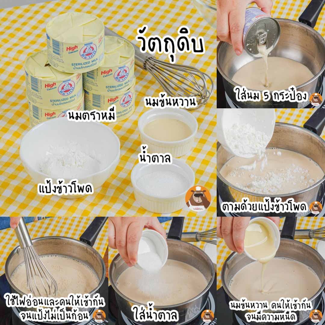 -เทนมหมี 5 กระป๋องลงในหม้อ ตามด้วยแป้งข้าวโ พ ด