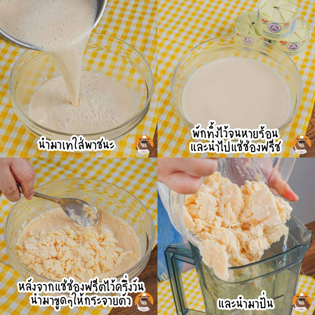 -หลังจากแช่ช่องฟรีซแล้วนำออกมาขู ดให้เ นื้ อกระจายตัว จากนั้นนำไปปั่นจนละเอียด