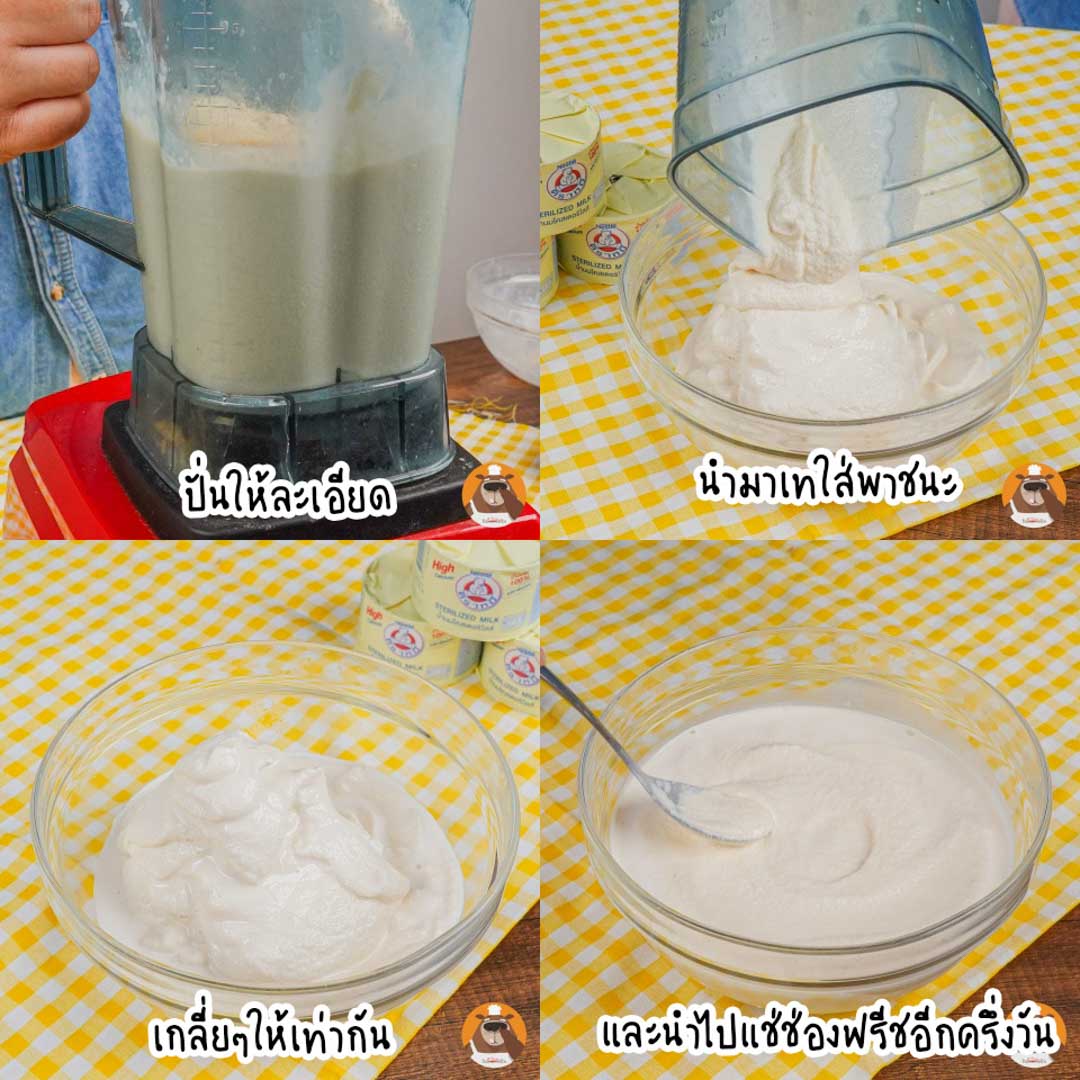 -เทใส่ภาชนะ เกลี่ยให้เท่ากัน นำไปแช่ช่องฟรีซต่ออีก 6 ชั่วโมง แช่ครบแล้วนำออกมากินได้