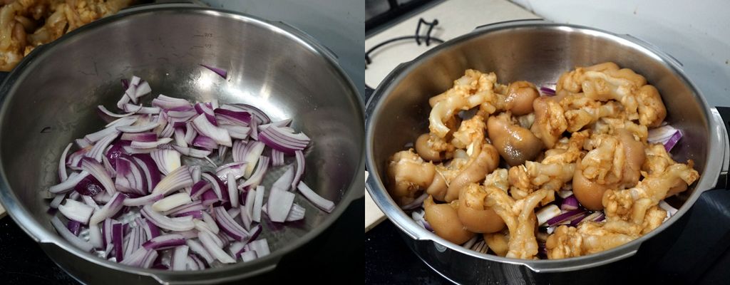 แล้วคลุกให้เข้ากัน เอาหอมหัวใหญ่ 1 หัวซอยหยาบๆ ลงในหม้อกระทะใส่เอ็นหมูคลุกซอสลงไป