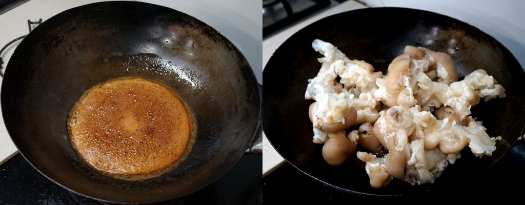 เตรียมซอสน้ำปลา ใช้น้ำตาล 1 ส่วนใส่ในกระทะตั้งไฟจนน้ำตาลละลายเปลี่ยนสีเป็นสีน้ำตาลไหม้ ใส่น้ำปลาปริมาตร 2 เท่าของน้ำตาลลงไป เคี่ยวจนเป็นเนื้อเดียวกัน จากนั้นใส่เอ็นหมูลงไปได้เลยคะ