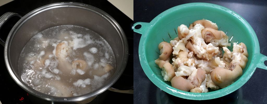 เอ็นหมู เป็นเอ็นหมูที่เลาะมาจากขาหมู นำมาต้มในน้ำเดือดประมาณ 5 นาที เพื่อล้างกลิ่นออก ล้างทำความสะอาดอีกครั้งคะ
