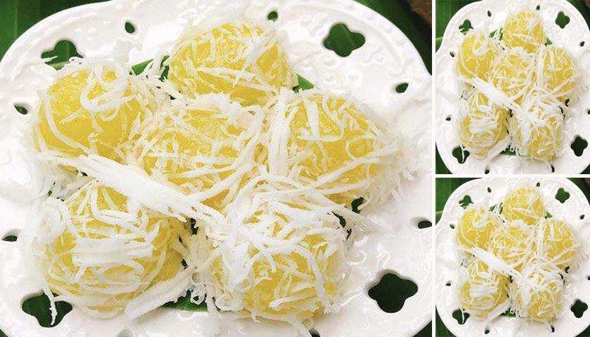 4. ทิ้งไว้ให้เย็นแล้วตัดเป็นชิ้นพอดีคำ นำไปคลุกกับมะพร้าวขูดแล้วทานได้เลย