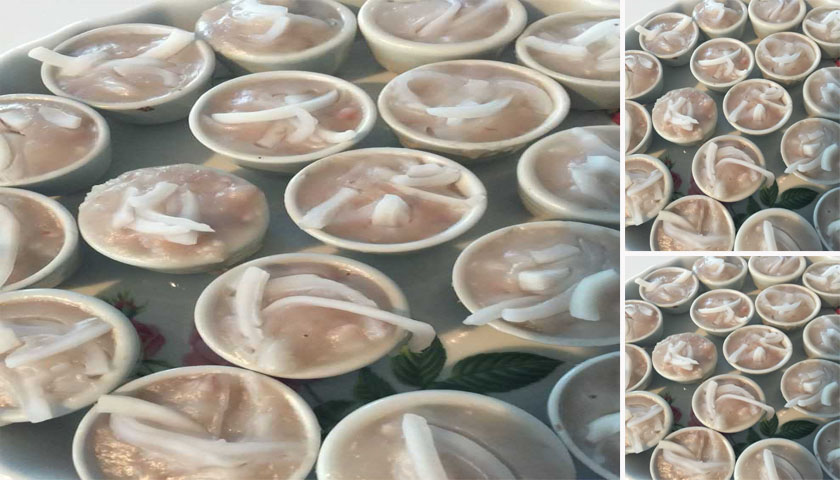 3. นึ่งถ้วยตะไลให้ร้อนจัด แล้วจึงตักขนมหยอดลงใป โรยด้วยมะพร้าวทึนทึกขูดฝอยที่เคล้ากับเกลือป่นเล็กน้อย นึ่งบนน้ำเดือดปานกลางประมาณ 15 นาที