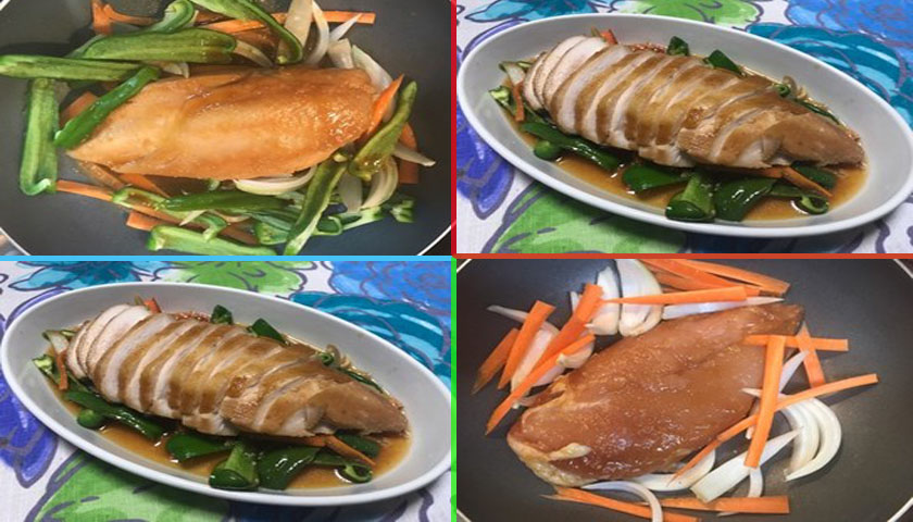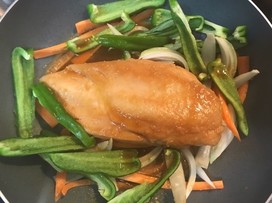 วางหนังอกไก่ลงในกระทะ โรยหัวหอมและแครอทให้ทั่ว แล้วจุดไฟปานกลาง