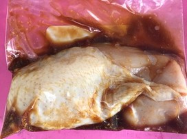 ใช้ส้อมเจาะรูมากมายในอกไก่ ใส่ส่วนผสม ลงในถุงซิปล็อคแล้วคลุกเคล้าให้เข้ากัน