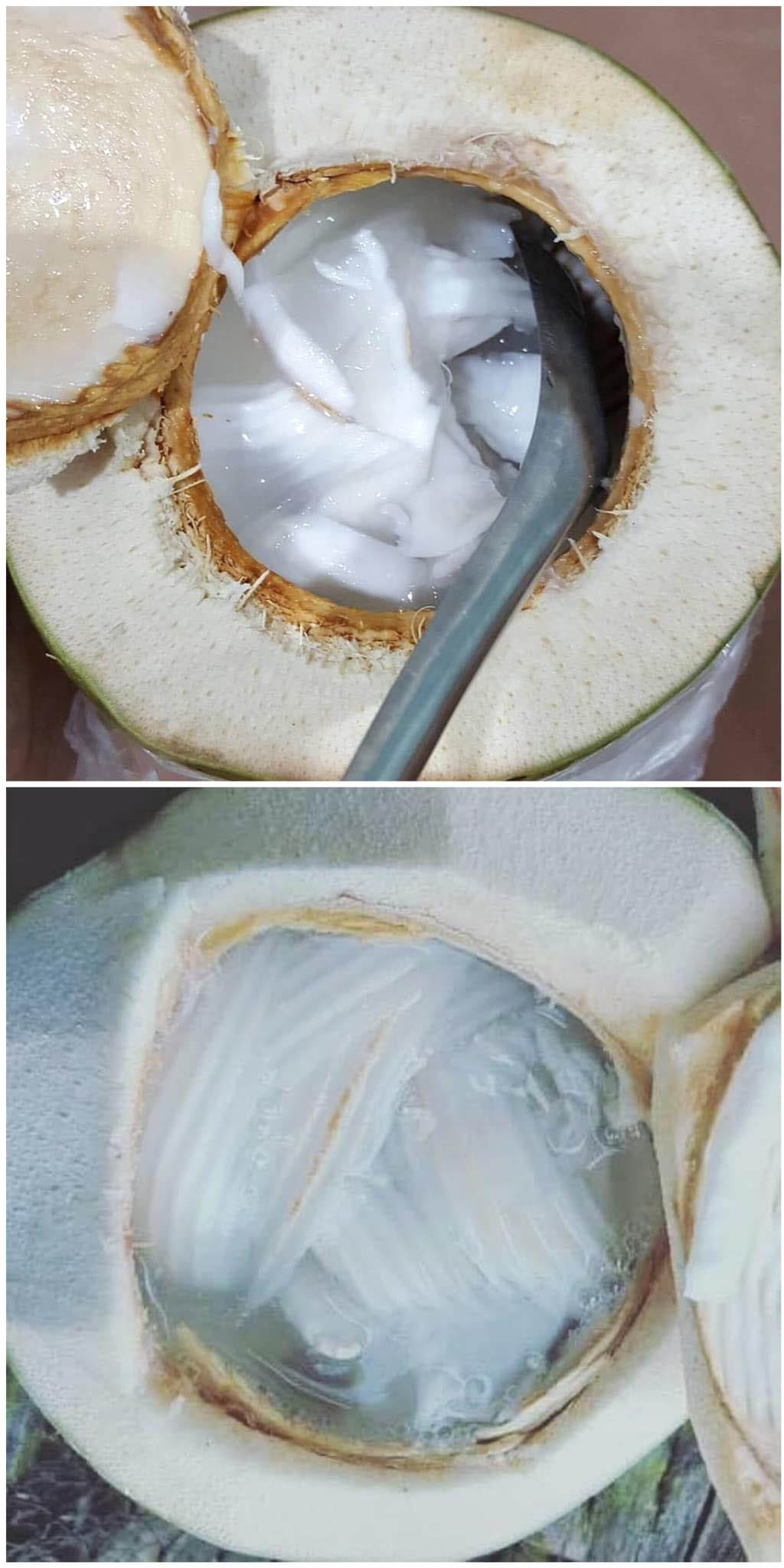 • ตักวุ้นใส่ในลูกมะพร้าว ค่อย ๆ ตัก ระวังร้อนค่ะ