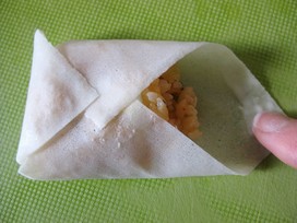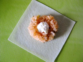 ตัดปอเปี๊ยะออกเป็น 4 ส่วนเท่า ๆ กันด้วยมีดทำครัว เมื่อข้าวเย็นลงแล้ว ให้วางข้าวหนึ่งช้อนโต๊ะไว้ตรงกลางปอเปี๊ยะแล้วห่อด้วยชีส ในรูปคือครีมชีสตรงกลาง