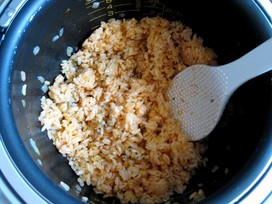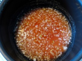 หุงข้าวตามปกติ เติมน้ำ  คอนซอมเม่ ใส่ซอสมะเขือเทศและซุปข้น คลุกเคล้าให้เข้ากัน ทิ้งไว้อย่างน้อย 30 นาที สับ หัวหอมอย่างแล้วใส่หุงข้าวตามปกติคะ