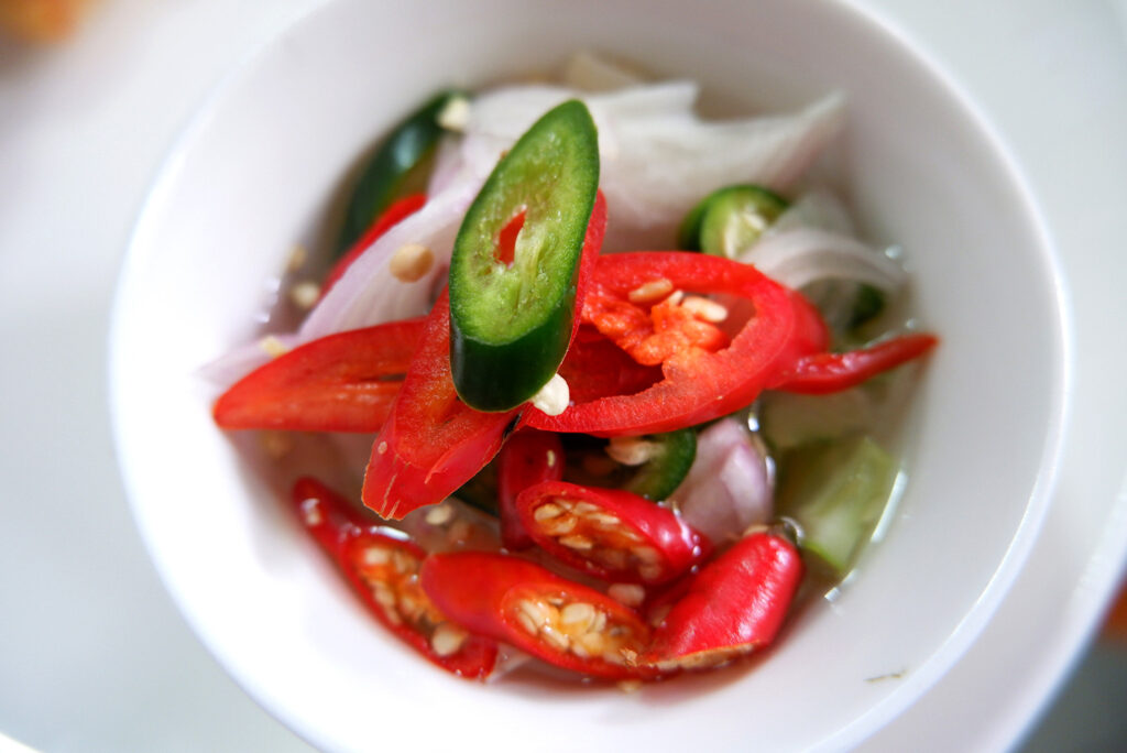 2. ซอยพริก หอมแดง แตงกวา ราดด้วยน้ำที่ทำไว้