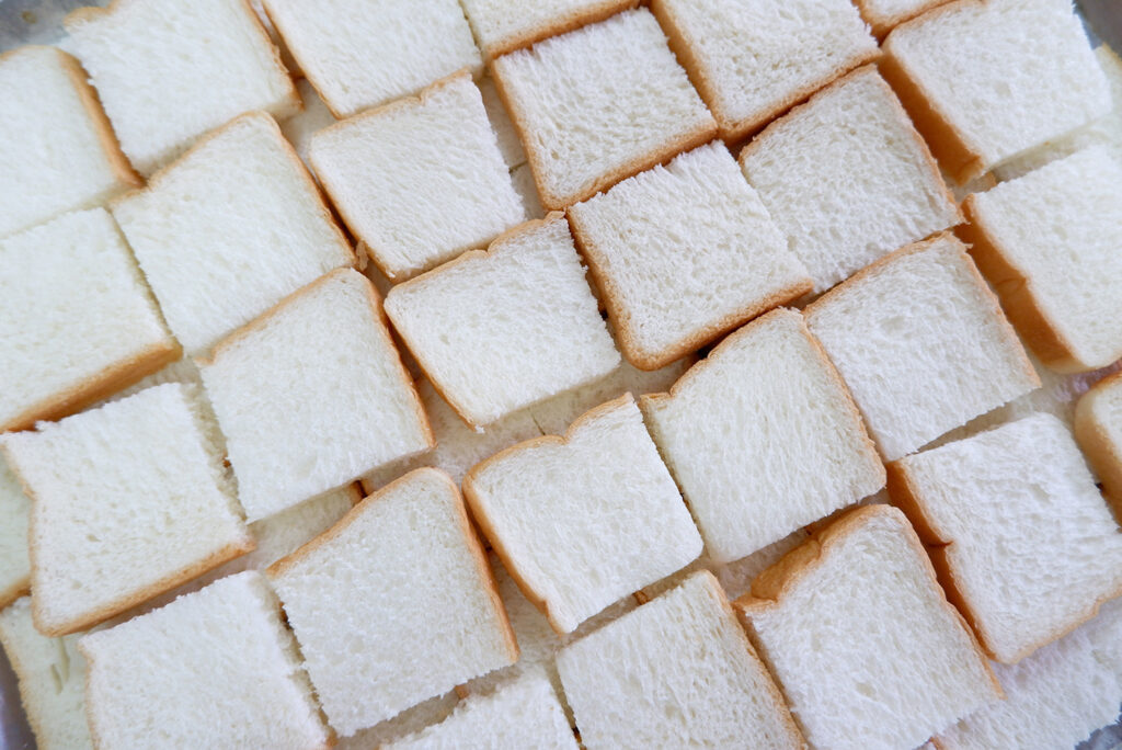 1. หั่นขนมปั ง 1 แผ่น ต่อ 4 ชิ้น จากนั้นนำผ้าขาวบางปิดไว้ แล้วผึ่งลมประมาณครึ่งวัน