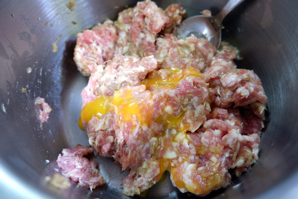 2.หมักหมูด้วยซีอิ๊วขาว น้ำตาลทราย สามเกลอ และไข่ไก่ 1 ฟอง ทิ้งไว้ประมาณ 15 นาที