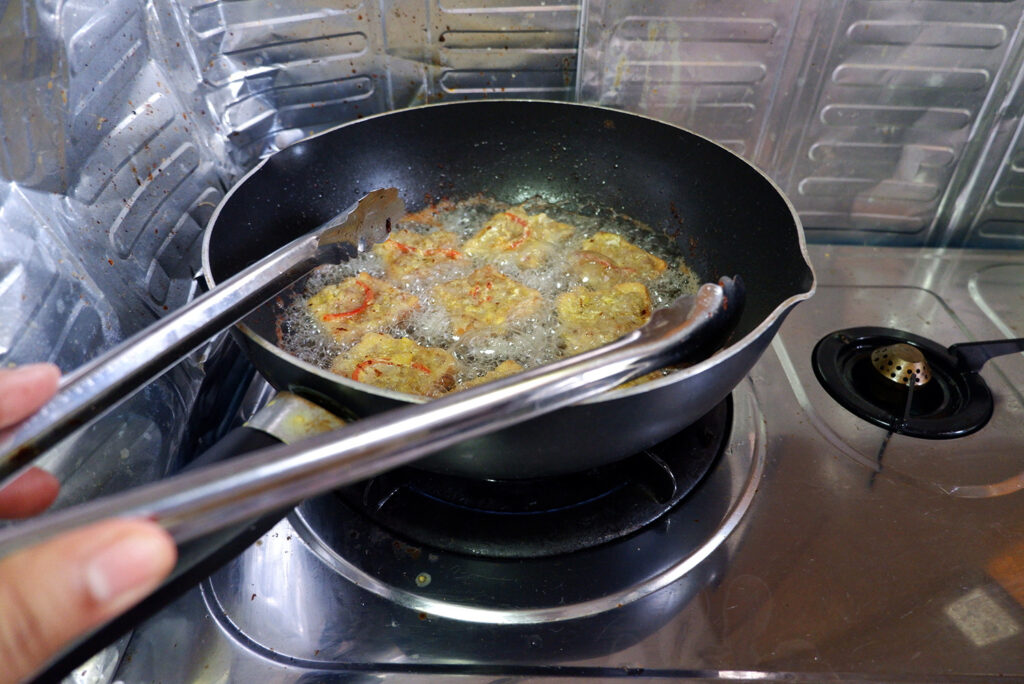 ตักขึ้นทีละชิ้น วางใส่กระชอน หรือวางบนกระดาษซับน้ำมัน แม่มณีแนะนำให้ใช้ที่คี บทอดนะคะ