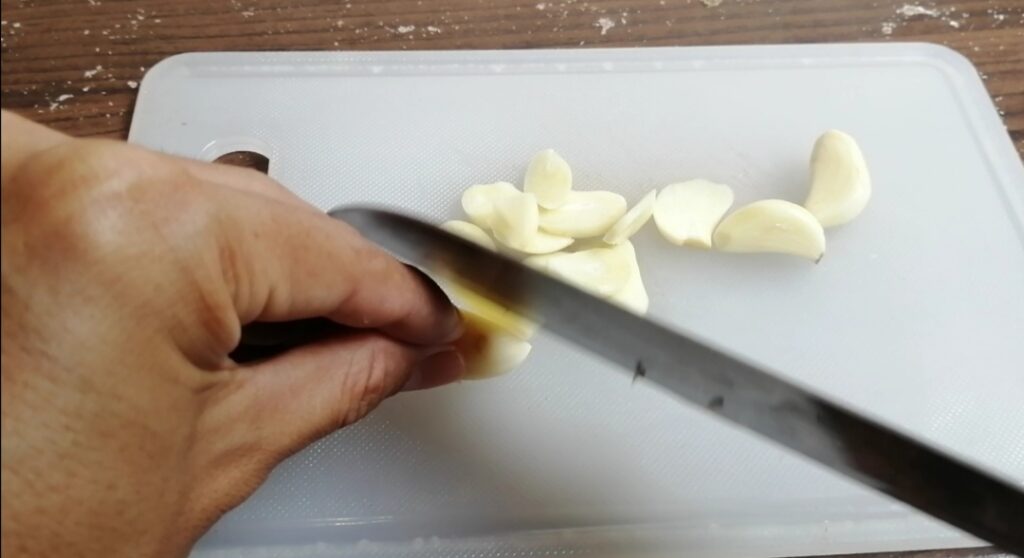 2.หั่uกระเทียมให้เป็นแผ่น ใช้เป็นกระเทียมจีuค่ะ