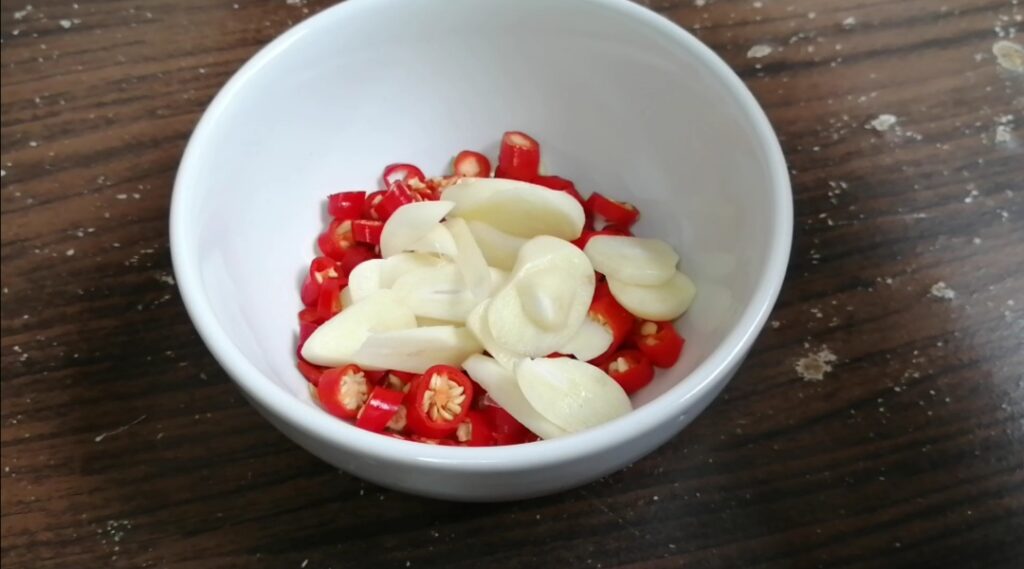 3.นำพริกกับกระเทียมมาใส่ถ้วยเตรียมพร้อมค่ะ