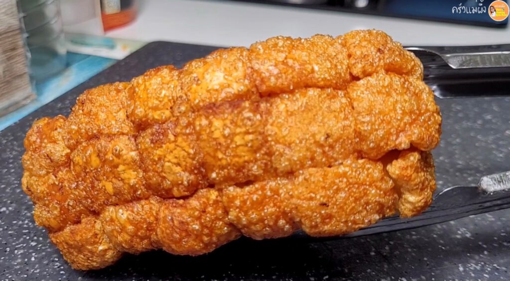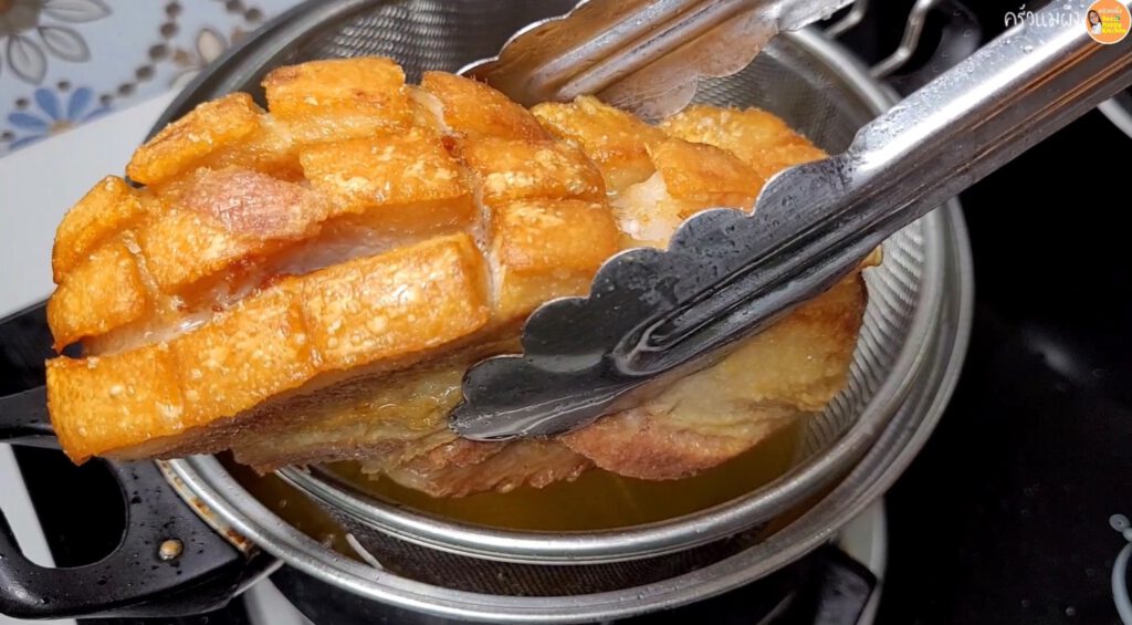 นำหมูที่แช่ฟรีสไว้ มาทอดครั้งที่ 2 นำส่วนหนังลงทอดในน้ำมันร้อน ไฟปานกลาง จนหนังกรอบฟู แล้วก็ทอดให้เหลืองกรอบน่าทานทั้งชิ้น