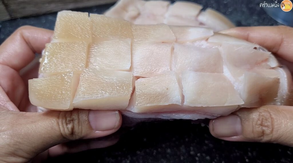 นำหมูมาบั้งให้หนังหมูเป็นริ้วๆ แบบนี้จะทำให้เครื่องปรุงซึมเข้าไปในเนื้อง่าย และเวลาทอดออกมาจะกรอบฟูสวยน่าทาน