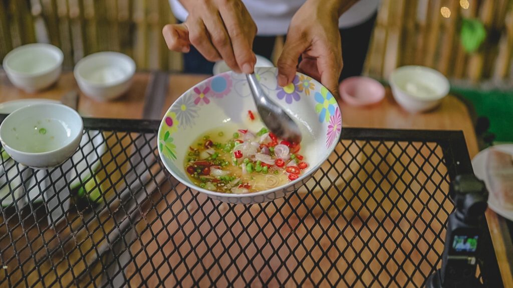 มาทำน้ำยำก่อนคะ ผสมน้ำปลากับน้ำตาลทรายน้ำมะนาวพร้อมหอมแดงซอยและพริกขี้หนูซอยคนผสมให้เข้ากัน สัดส่วนตามชอบ