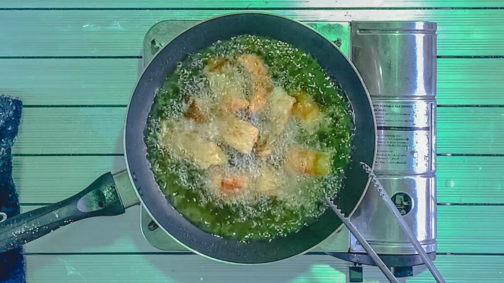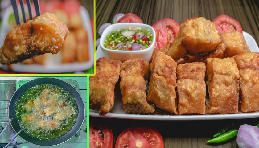 ตั้งกระทะเปิดเตาใส่น้ำมันรอให้น้ำมันร้อน ระหว่างรอน้ำมันร้อนเอาปลามาคลุกเคล้ากับแป้งทอดกรอบให้ทั่วๆ
