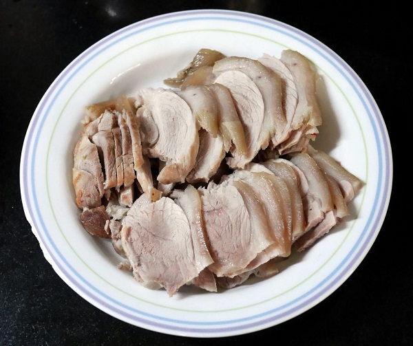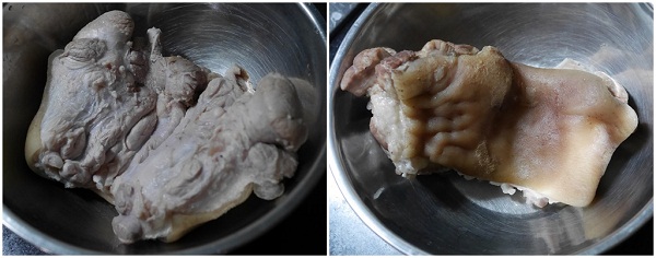 นำเนื้อขาหมูไปต้มด้วยไฟอ่อนจนเปื่อย ประมาณ 45 นาที แล้วหั่นเป็นชิ้น ๆ เตรียมรอไว้