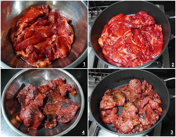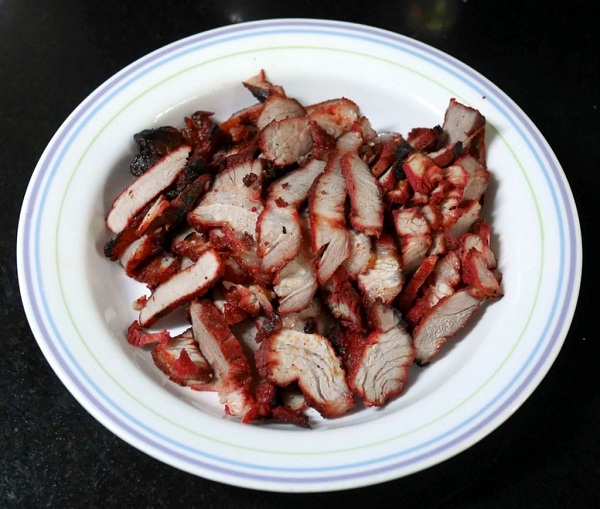 หมักสันคอหมูกับน้ำผึ้ง ผงพะโล้ เกลือ และสีผสมอาหารสีแดง หมักไว้ 1 ชั่วโมงแล้วก็นำมาทอดจนสุก หั่นเป็นชิ้น ๆ รอเตรียมไว้