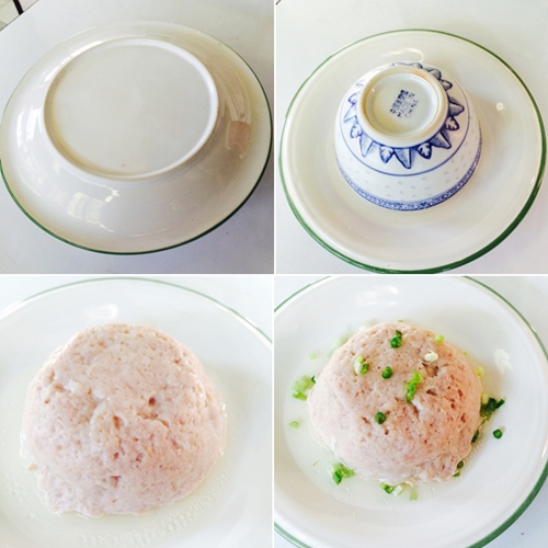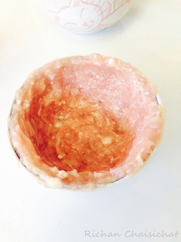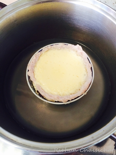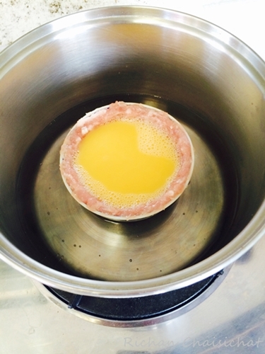 แล้วเทส่วนผสมไข่ไก่ลงในถ้วยหมูบด ใส่น้ำลงในหม้อ ต้มจนเดือดแล้วเบาไฟลง ใส่ถ้วยไข่วางลงในหม้อ (วิธีนี้สำหรับคนไม่มีซึ้ง)