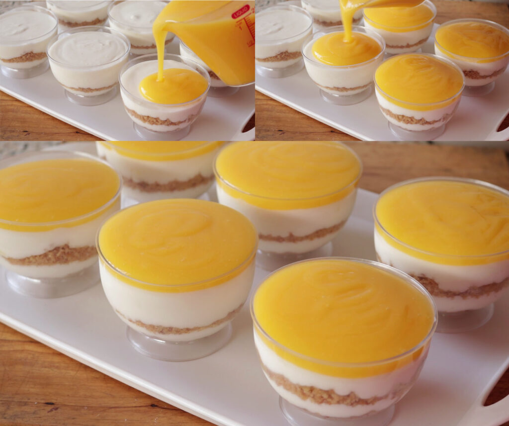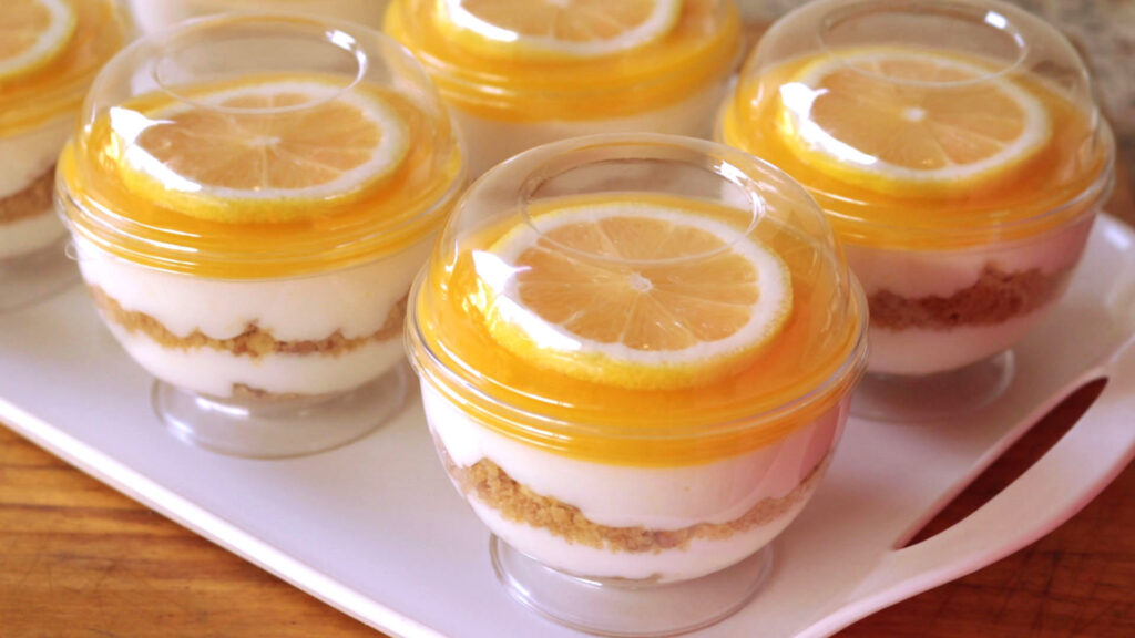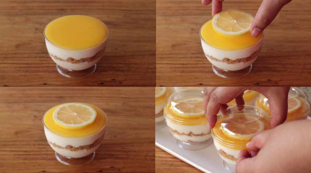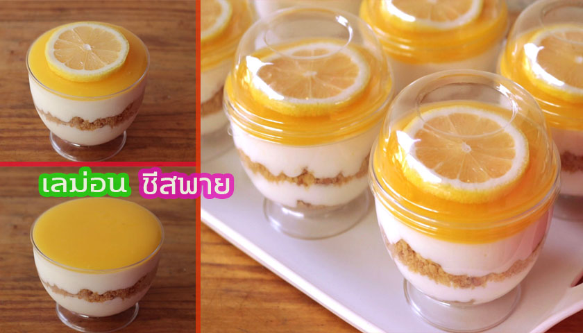 จากนั้นเทลงบนถ้วยเลม่อนชีส พักให้เซตตัวในตู้เย็น 6 ช.ม.