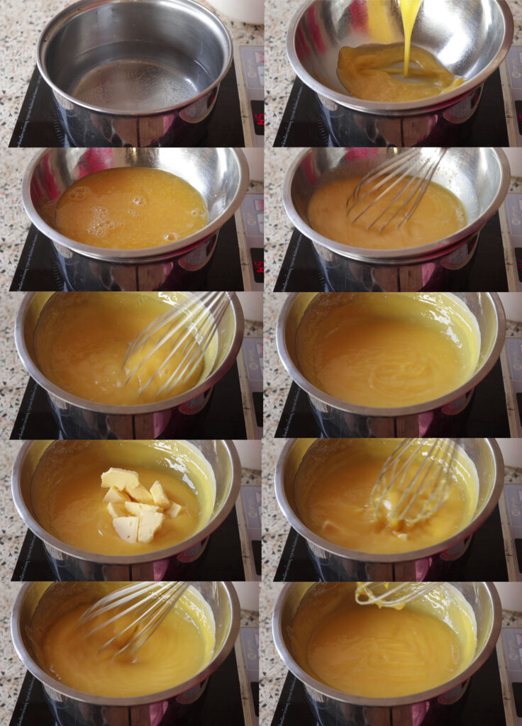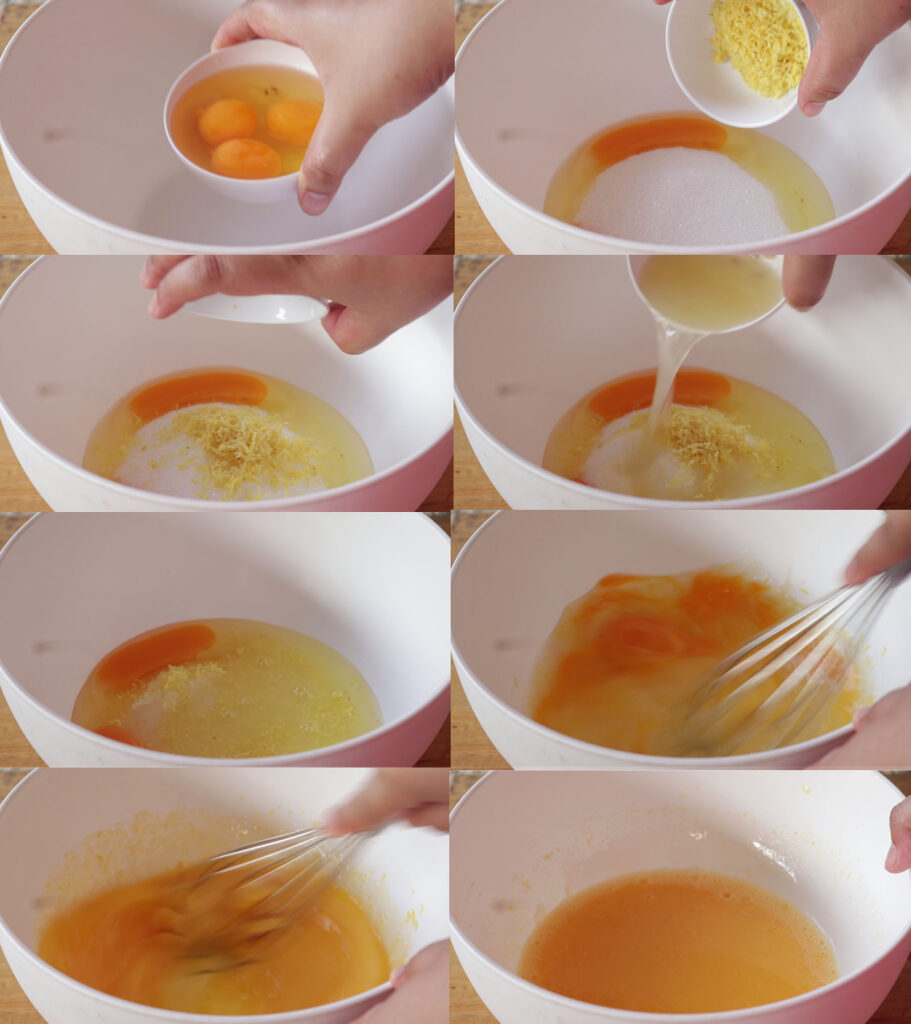 ไข่ไก่ และน้ำตาลทรายผิวเลม่อน น้ำเลม่อน ตีจนทุกอย่างเข้ากันและน้ำตาลทรายละลาย