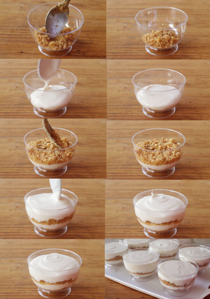 แล้วก็ตักบิสกิตลงไปในถ้วย ตักชีสเค้กลงไปสลับชั้นกับบิสกิต นำไปแช่ในตู้เย็น