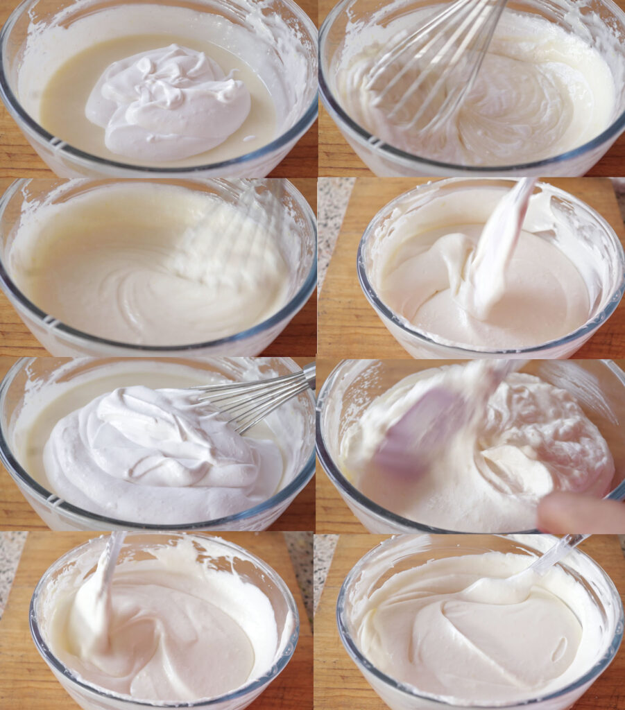 แล้วตักวิปปิ้งครีมลงไปบางส่วน ค่อยๆแล้วตะล่อมจนเข้ากัน จากนั้นเทวิปปิ้งครีมส่วนที่เหลือลงไปและตะล่อมคนให้เข้ากัน