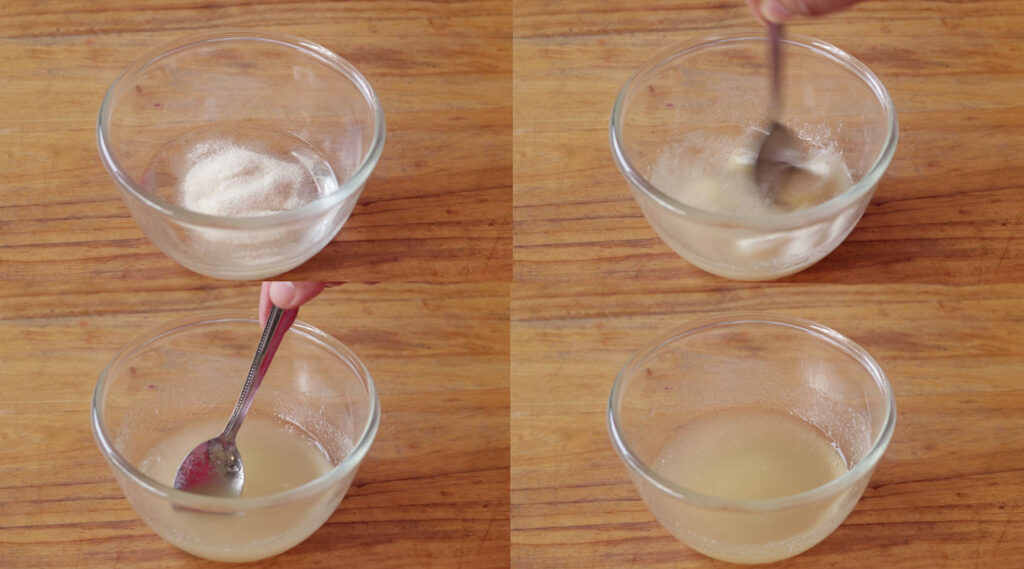 เริ่มผสมเจลาตินกับ น้ำเปล่า คนให้เข้ากัน พักไว้ 10 นาที