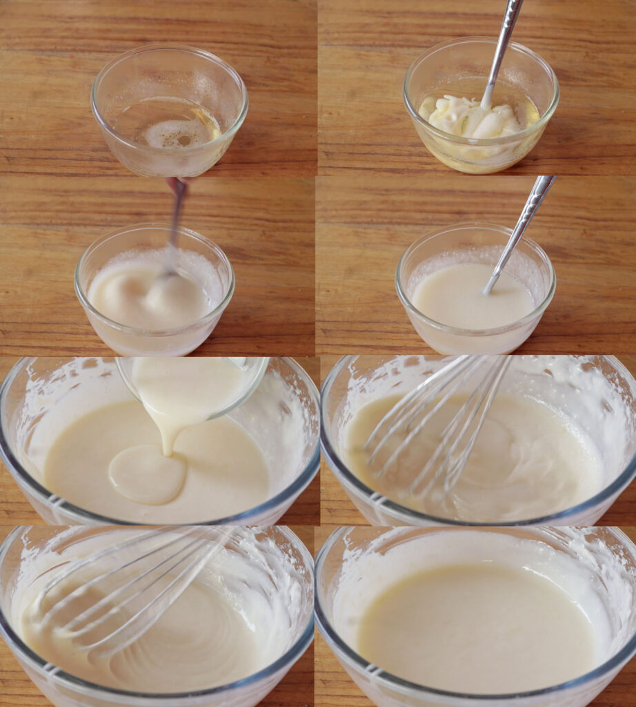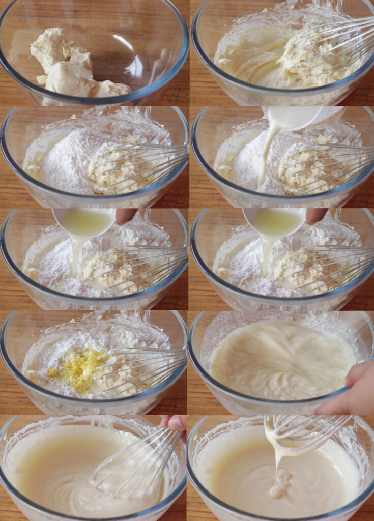 จากนั้นใส่ครีมชีส น้ำตาลไอซิ่ง นมจืด น้ำเลม่อน และผิวเลม่อน แล้วคนหรือตีให้เข้ากัน