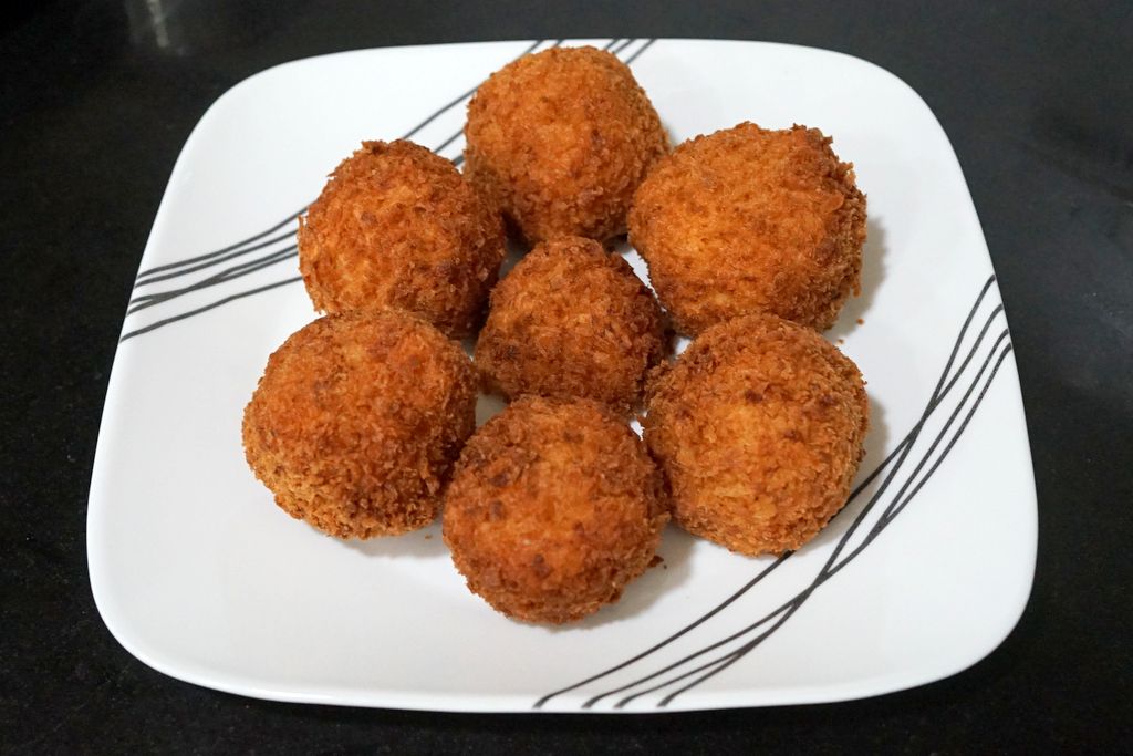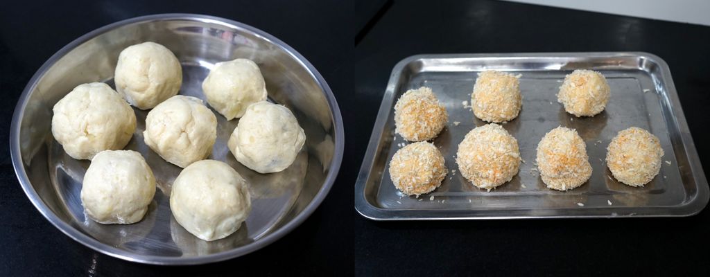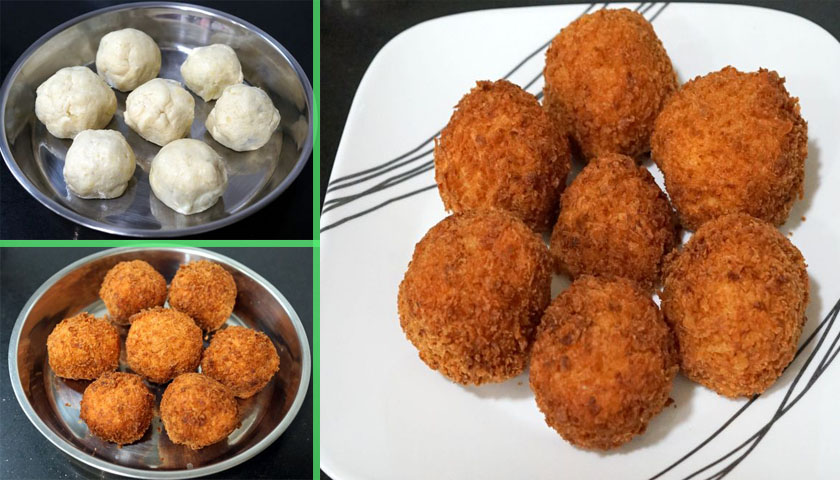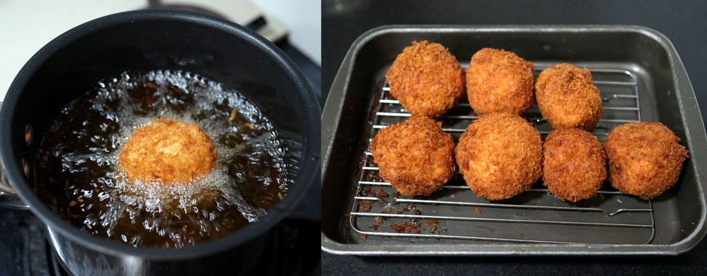 จากนั้นปั้นมันฝรั่งยัดไส้ก้อนหมูสับ นำไปชุบแป้ง ไข่ และ เกล็ดขนมปัง พักไว้ 15 นาที