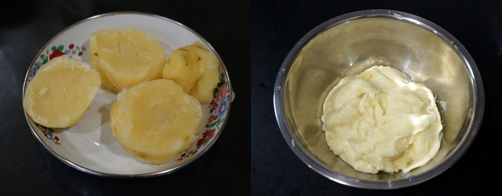 นำมันฝรั่งปอกเปลือก หั่นเป็นชิ้นใหญ่ ต้มจนสุกนิ่ม บดเนื้อมันฝรั่งให้ละเอียดมา ผสมไข่ เกลือ แป้ง จนเหนียวสามารถปั้นเป็นก้อนได้