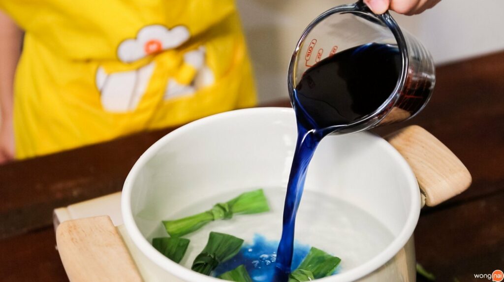นำหม้อขึ้นตั้งบนเตาใช้ไฟปานกลาง จากนั้นใส่น้ำเปล่าลงไปในหม้อ ตามด้วยน้ำอัญชัน น้ำตาลทรายขาว และใบเตยคนให้น้ำตาลละลายและน้ำลอยแก้วเริ่มร้อน แล้วปิดไฟใส่ลูกตาลลงไป