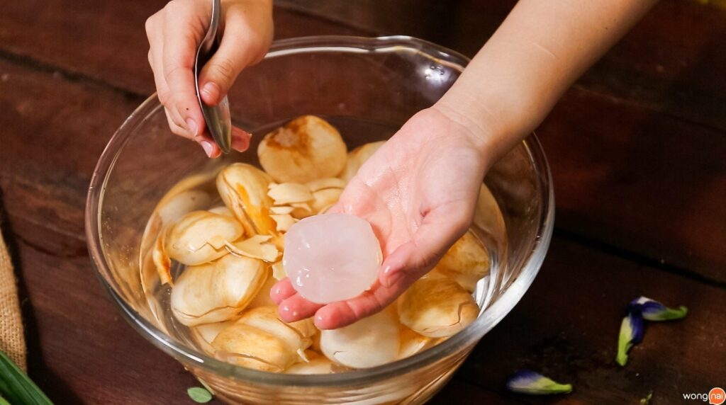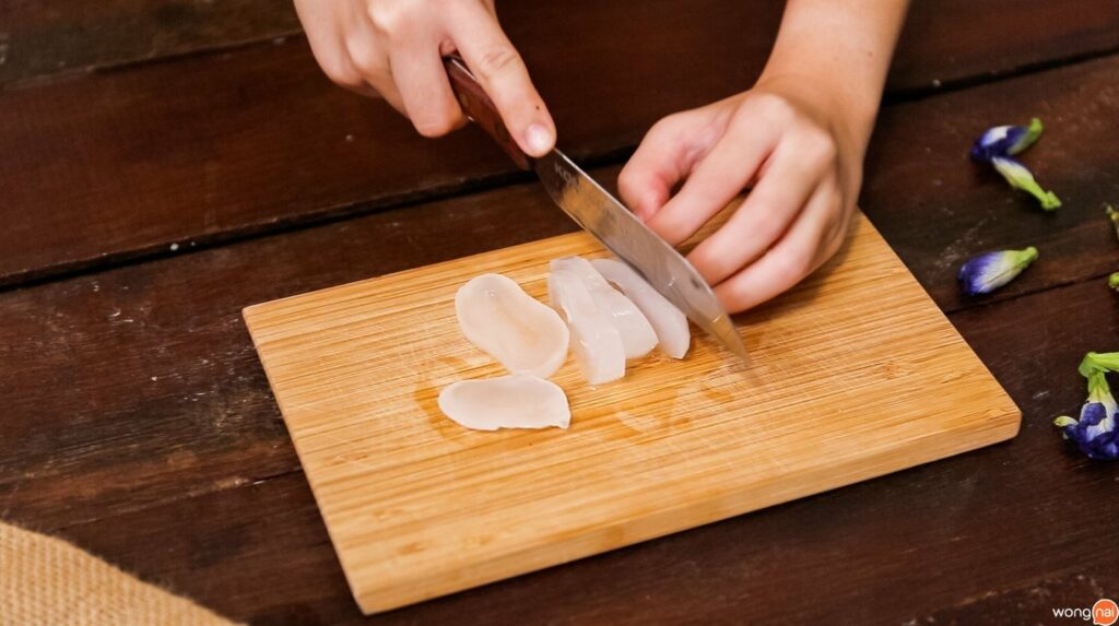 เริ่มนำลูกตาลสดมาปอกเปลือกด้วยช้อน จากนั้นนำลูกตาลมาหั่นเป็นชิ้น ๆพอคำ เพื่อเตรียมไว้นำไปลอยแก้ว