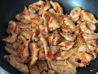 เริ่มปั่นพริกกระเทียมให้ ละเอียด ตามชอบ ตั้งเตาใส่น้ำมัน ผัดหมูเด้งให้สุกดี
