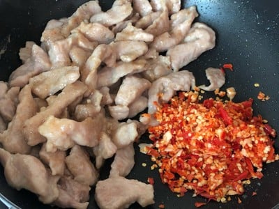 แล้วใส่พริกกระเทียม ปรุงรสด้วยน้ำตาลทราย และผงปรุงรสหมู ผัดให้เข้ากัน