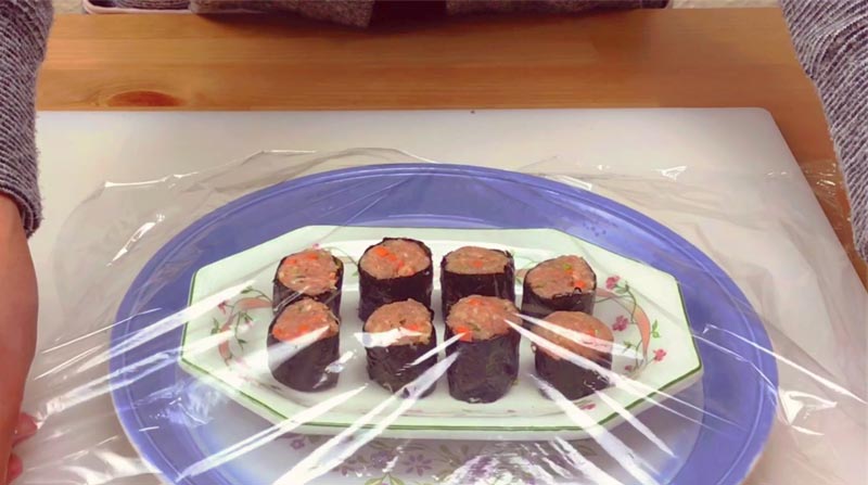 แล้วนำไปห่อกับสาหร่าย เสร็จแล้วตัดเป็นชิ้นขนาดตามต้องการได้เลยค่ะ