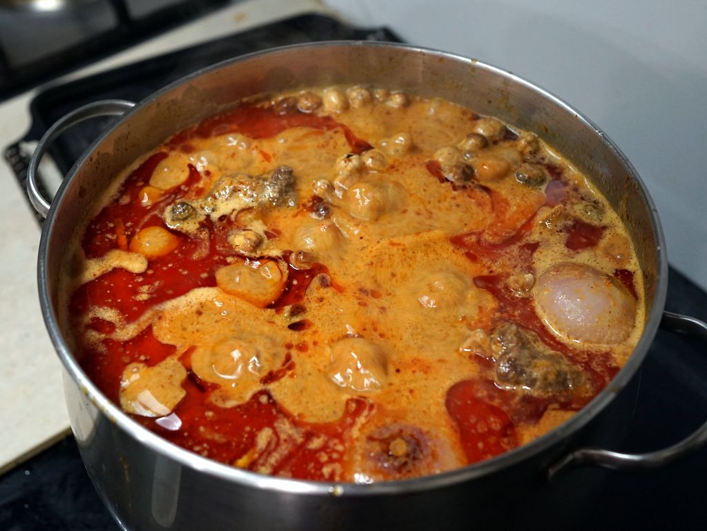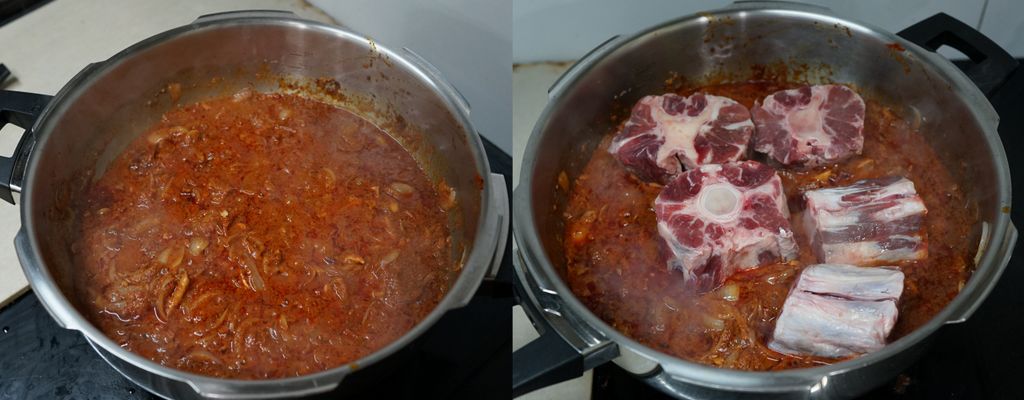 ผัดให้หางวัวเข้ากันกับเครื่องแกง แล้วต้มภายใต้ความดัน 50 นาที จนหางวัวเปื่อยนิ่ม