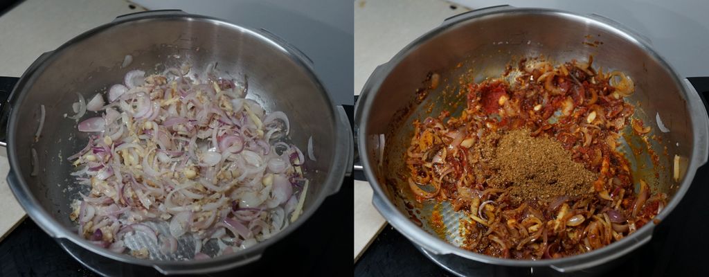 แล้วนำหอมใหญ่ซอย กระเทียม ขิง นำไปผัดกับน้ำมัน ในหม้อความดัน ผัดให้หอม ใส่พริกแกงมัสมั่นลงไปผัดเข้ากัน