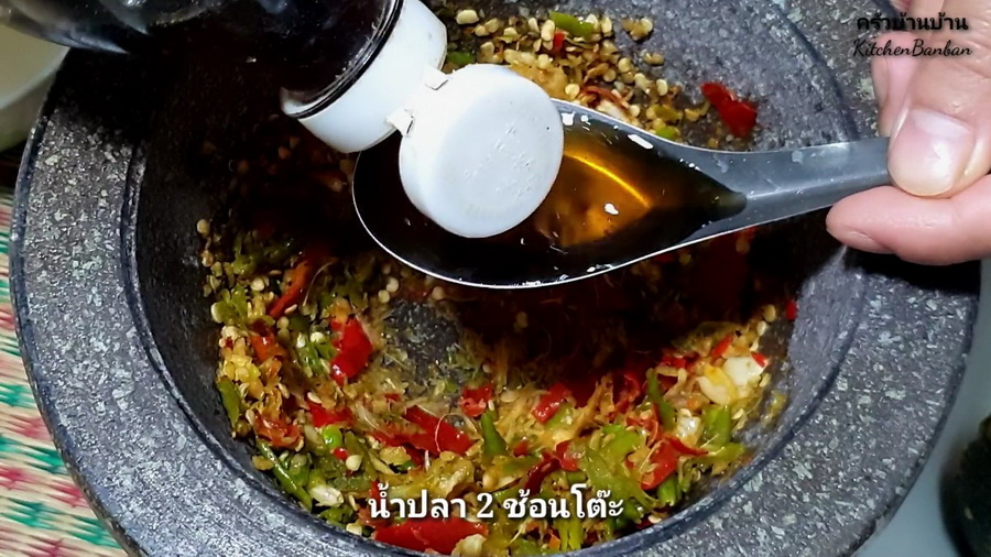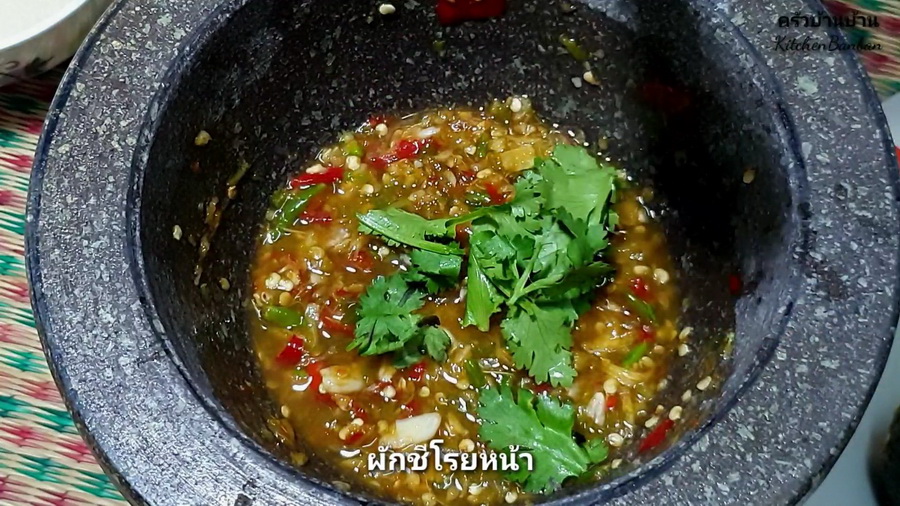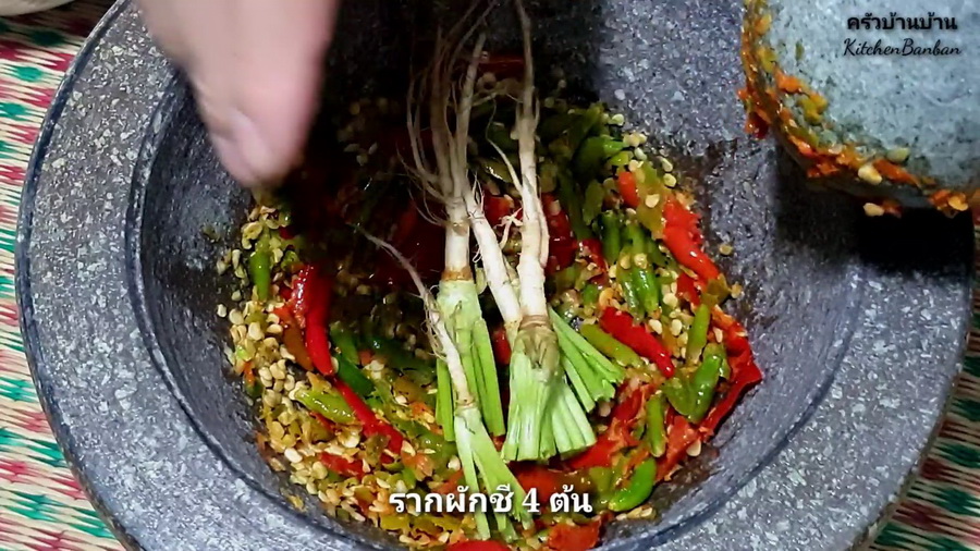 นำพริก รากผักชี และกระเทียมลงโขลก ละเอียด