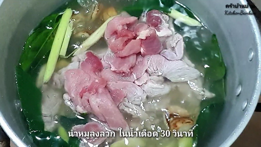 แล้วนำหมูที่เตรียมไว้ ลงลวก 30 วินาที แล้วตักขึ้นทันที