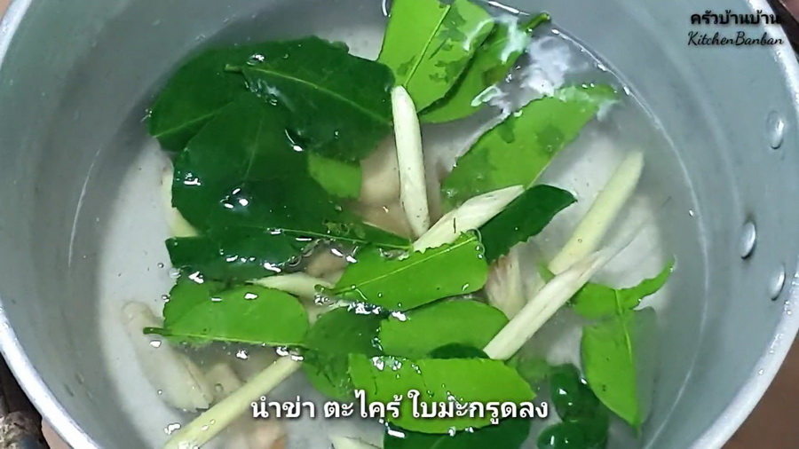 ต้มน้ำให้เดือด แล้วนำคนอร์และเกลือลงหม้อ นำข่า ตะไคร้ ใบมะกรูด ลงต้มในน้ำเดือด