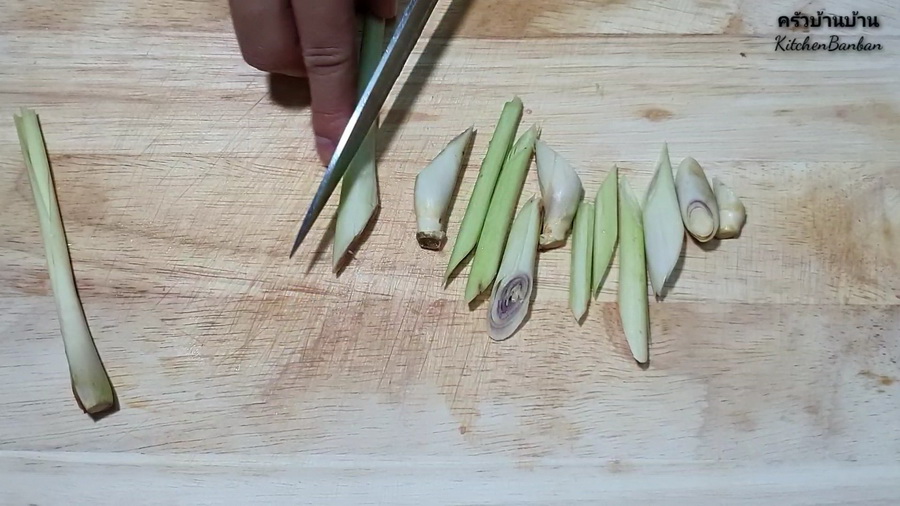 แล้วเตรียมหั่น ข่า ตะไคร้ และใบมะกรูด ไว้