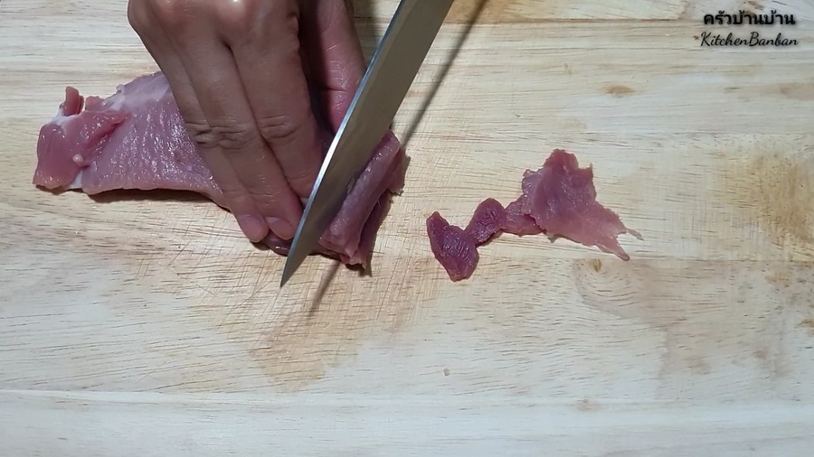 เริ่มหั่นหมูเป็นชิ้นๆ พอดีคำไม่ใหญ่มาก