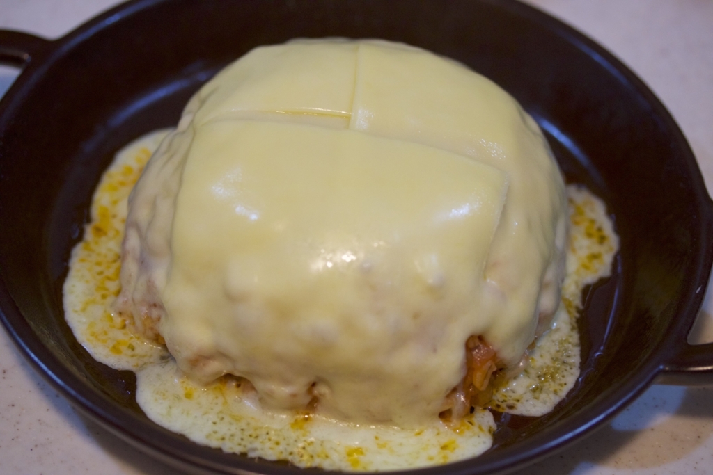 คลุมด้วยชีสหั่นบาง ๆ แล้วอุ่นในเตาไมโครเวฟ ประมาณ  2 นาทีครึ่ง