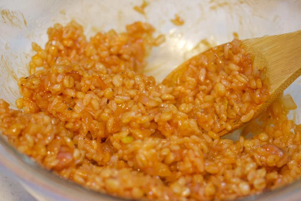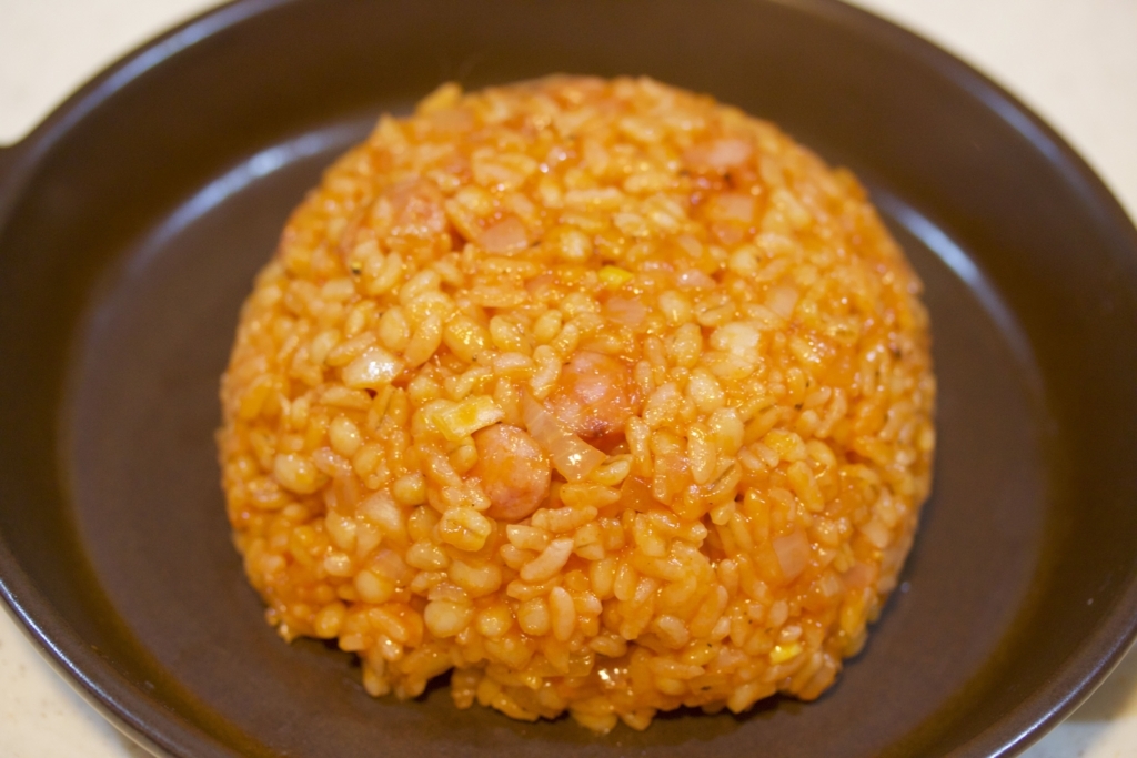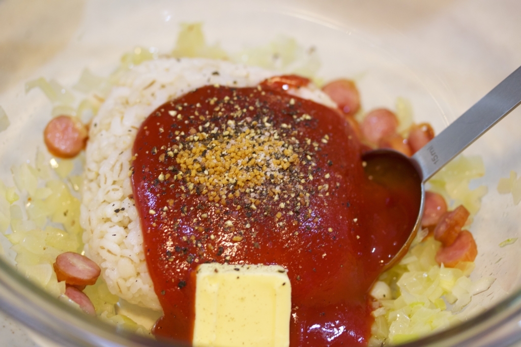 จากนั้นใส่ข้าวสุก และ ซอสมะเขือเทศ เนย เกลือพริกไทยเล็กน้อย
