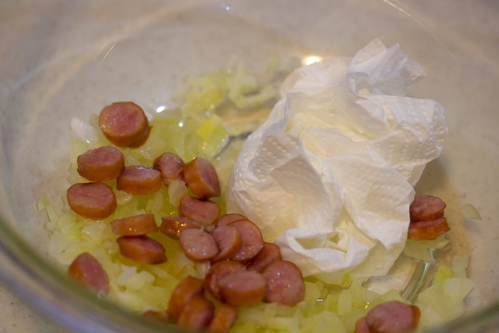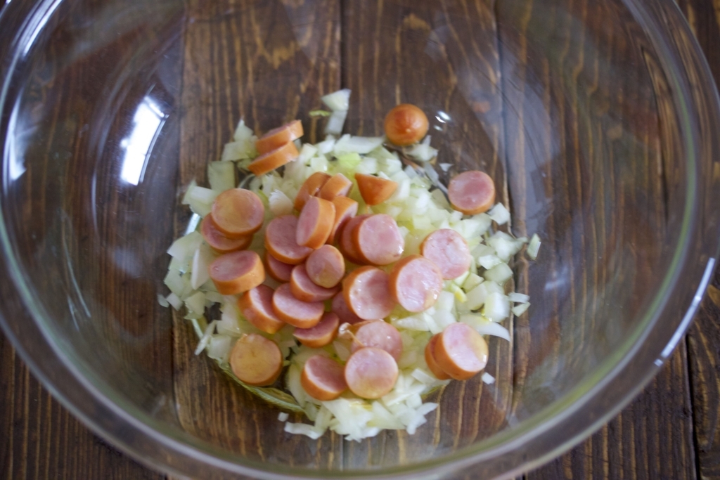 ใส่หัวหอมและไส้กรอกลงในชามทนความร้อนแล้วโรยด้วยน้ำมันมะกอก  แล้วอุ่นในไมโครเวฟ  2 นาที